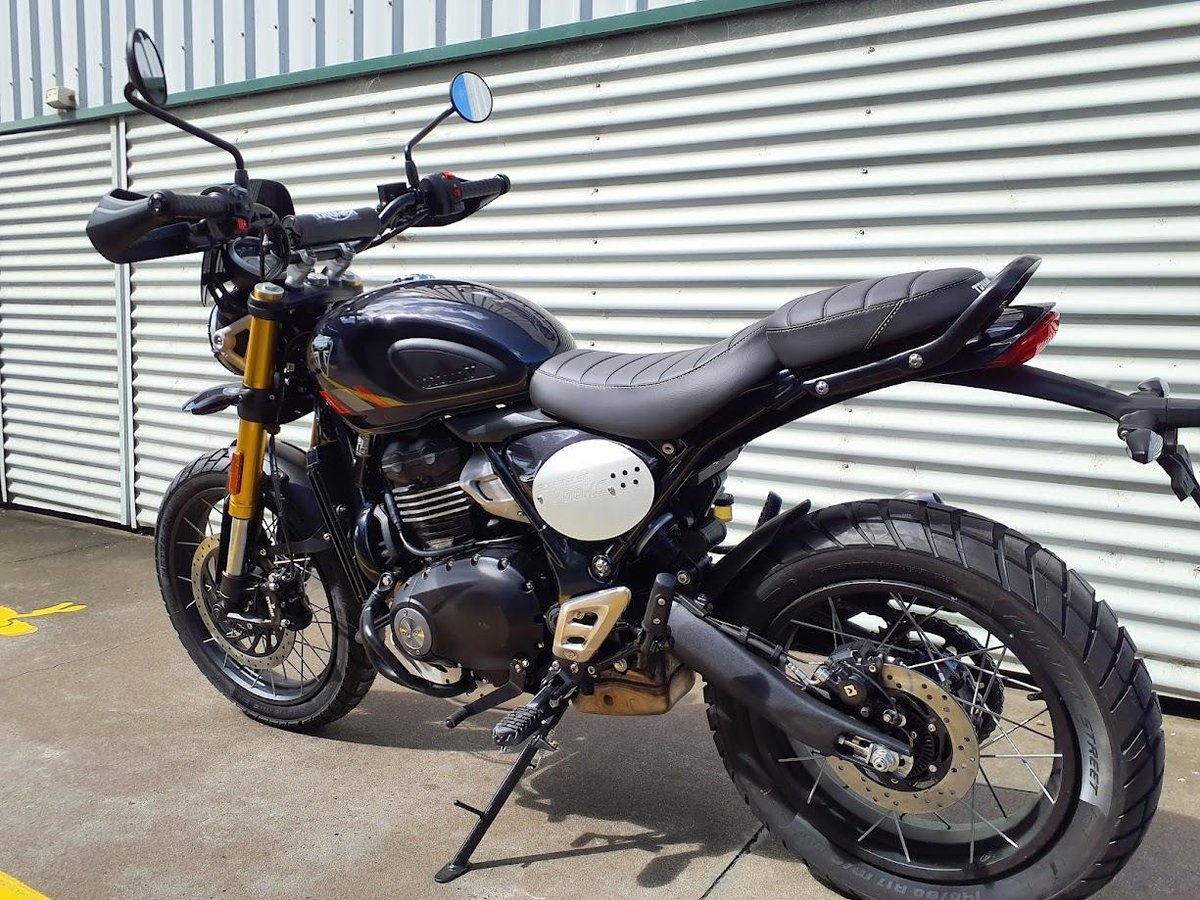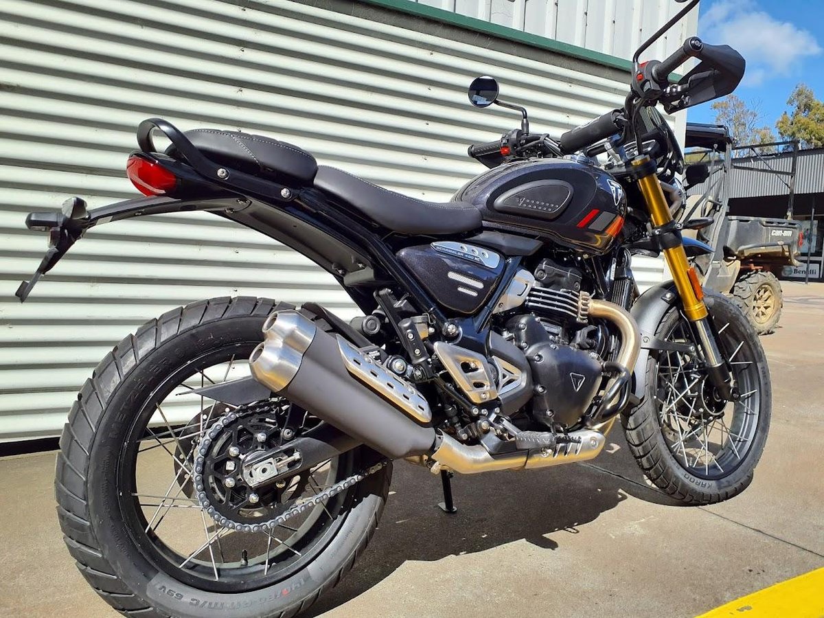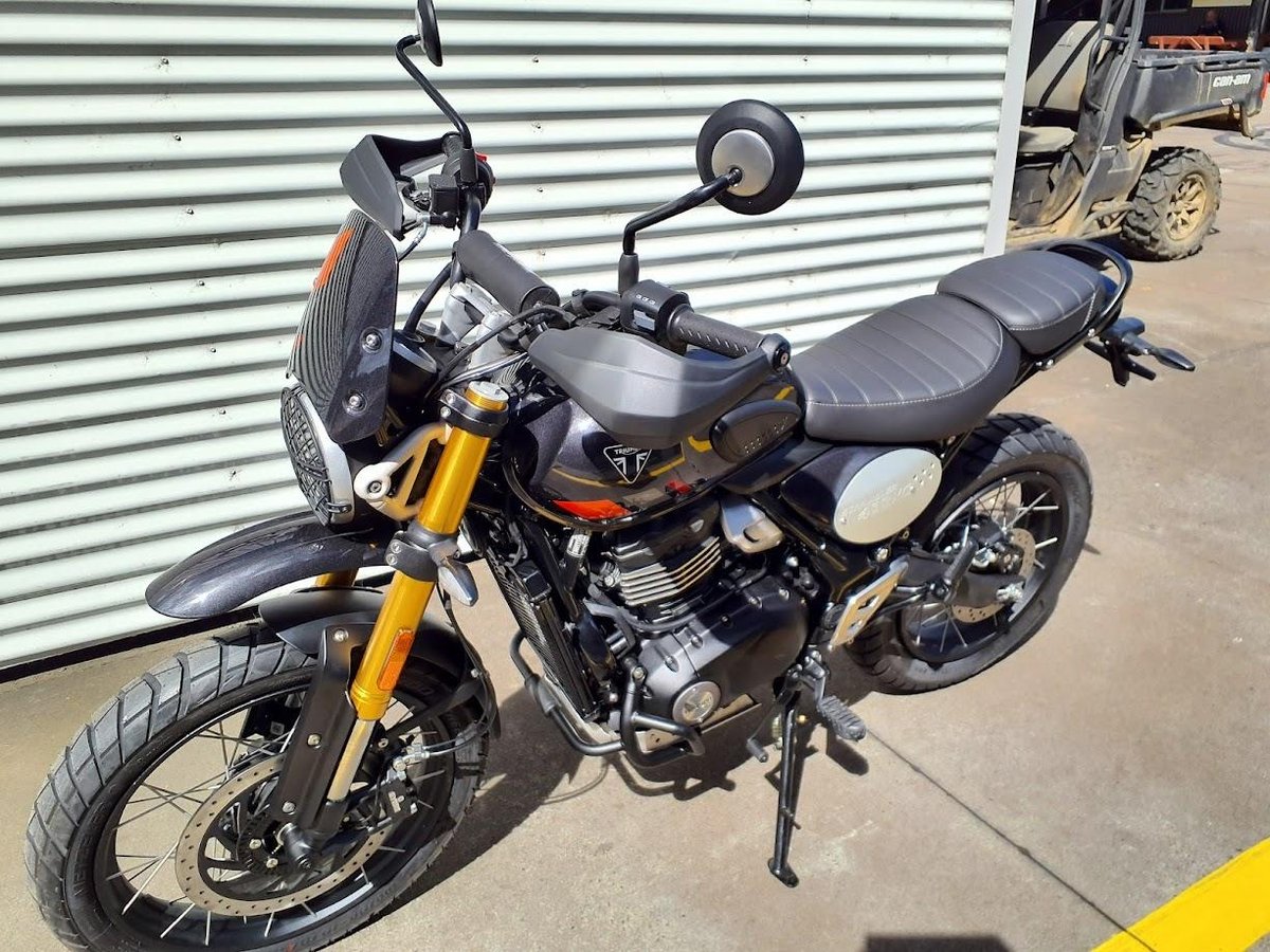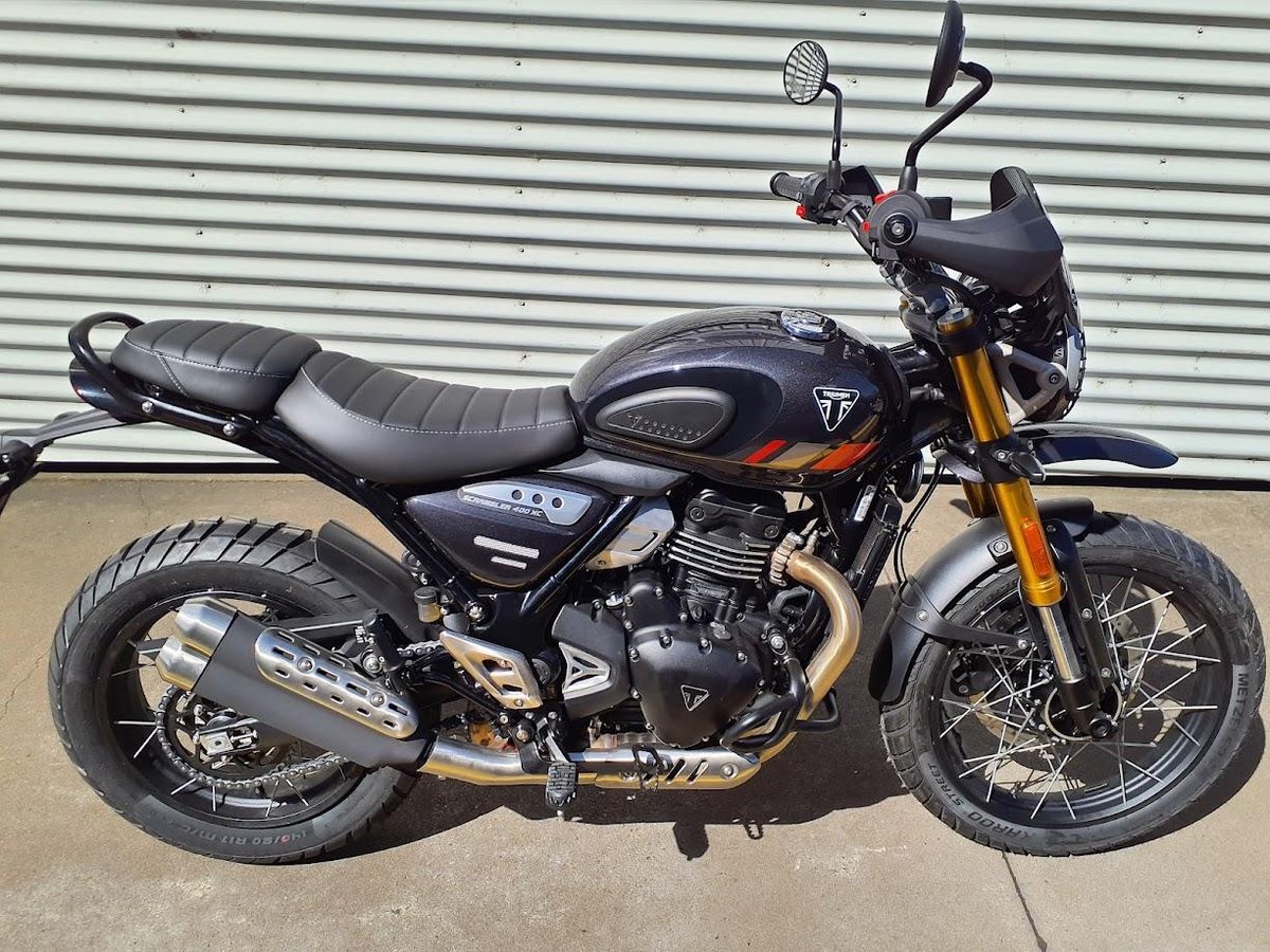 Learner Approved MotorCycle. The 2026 Triumph Scrambler 400 XC is a lightweight retro-styled scrambler powered by a 398.4 cc liquid-cooled single-cylinder engine that balances manageable power with everyday usability. It uses a 6-speed gearbox, rides on a steel frame with a relatively upright, comfortable riding posture, and is equipped with dual-purpose tires and suspension that handle both city streets and light off-road or gravel roads. With tank and ergonomics designed for versatility, it offers a modern classic vibe suitable for urban commuting or relaxed adventure riding.