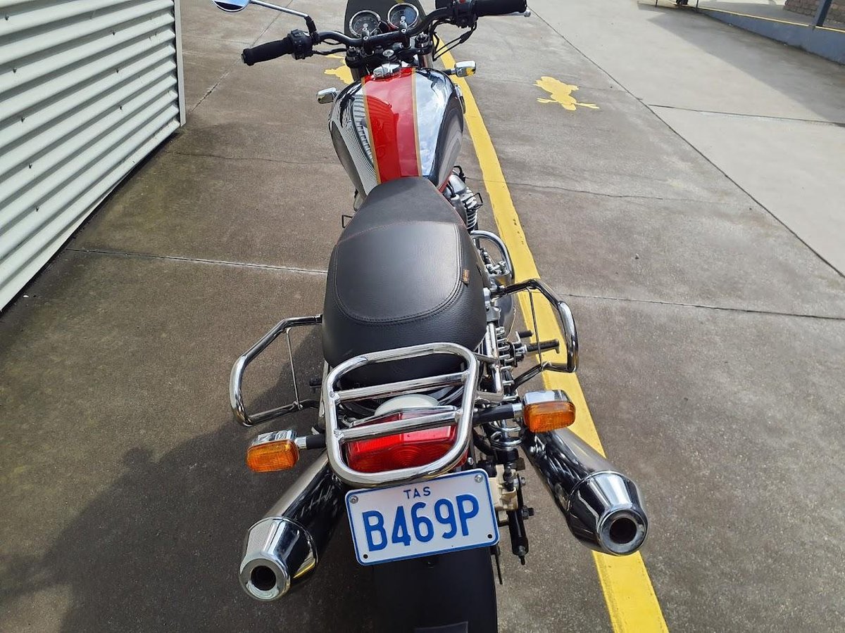 This example is fitted with pannier racks, a windshield, and a top box mounting rack, transforming it from a simple classic roadster into a practical light-touring setup. These additions improve storage capacity and wind protection, making it far more suitable for commuting or longer rides while keeping its classic chrome styling intact.