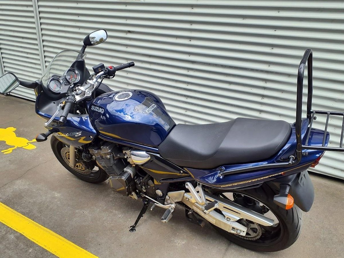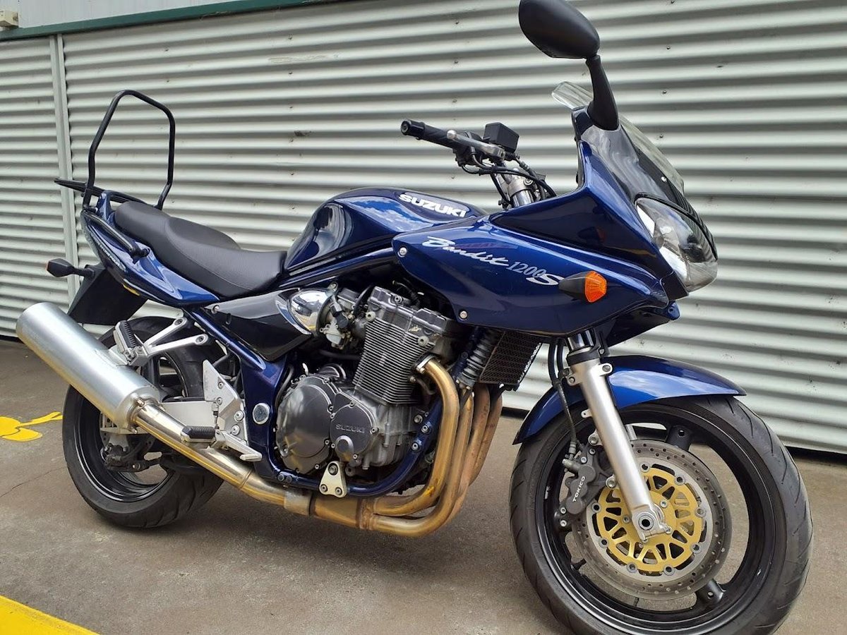 The 2001 Suzuki Bandit 1200S is a sporty yet practical naked/on-road bike powered by a 1,157 cc liquid-cooled inline-four engine that delivers strong mid-range torque and smooth power delivery. It uses a 6-speed gearbox, chain final drive, and a steel frame with conventional suspension ideal for street and highway riding. With a comfortable upright riding position and a partially-faired design, it's suited for daily commuting, spirited rides, and occasional touring.