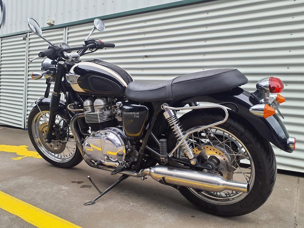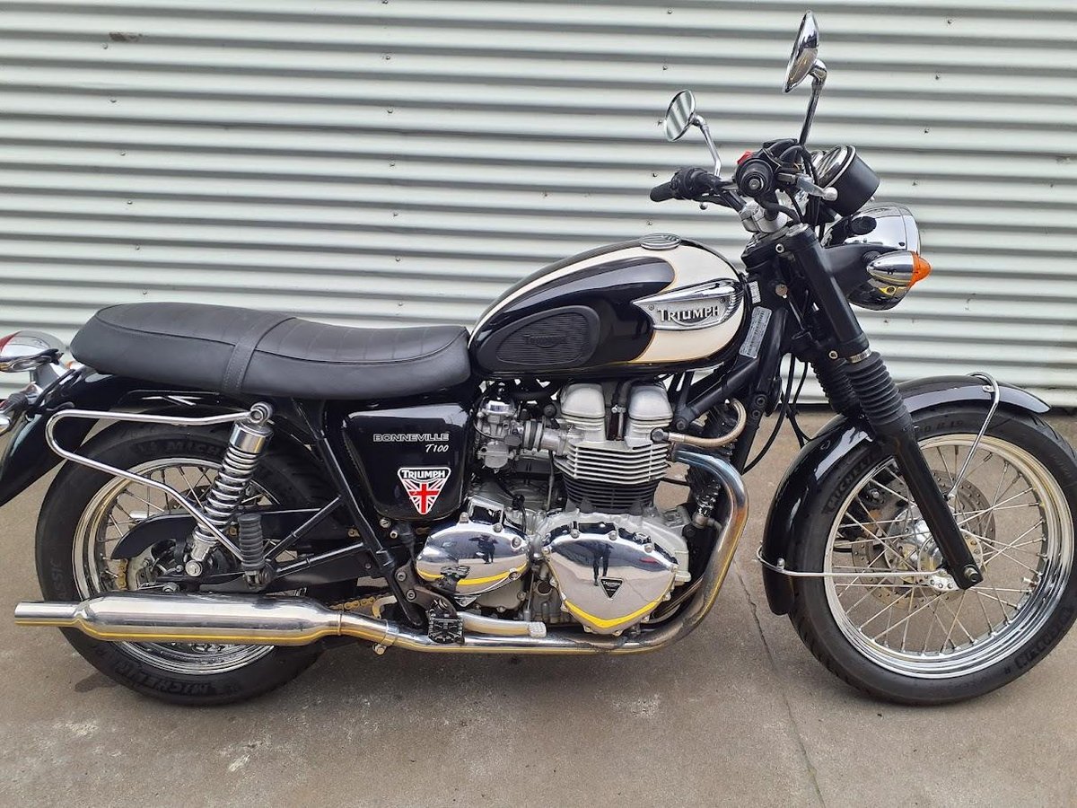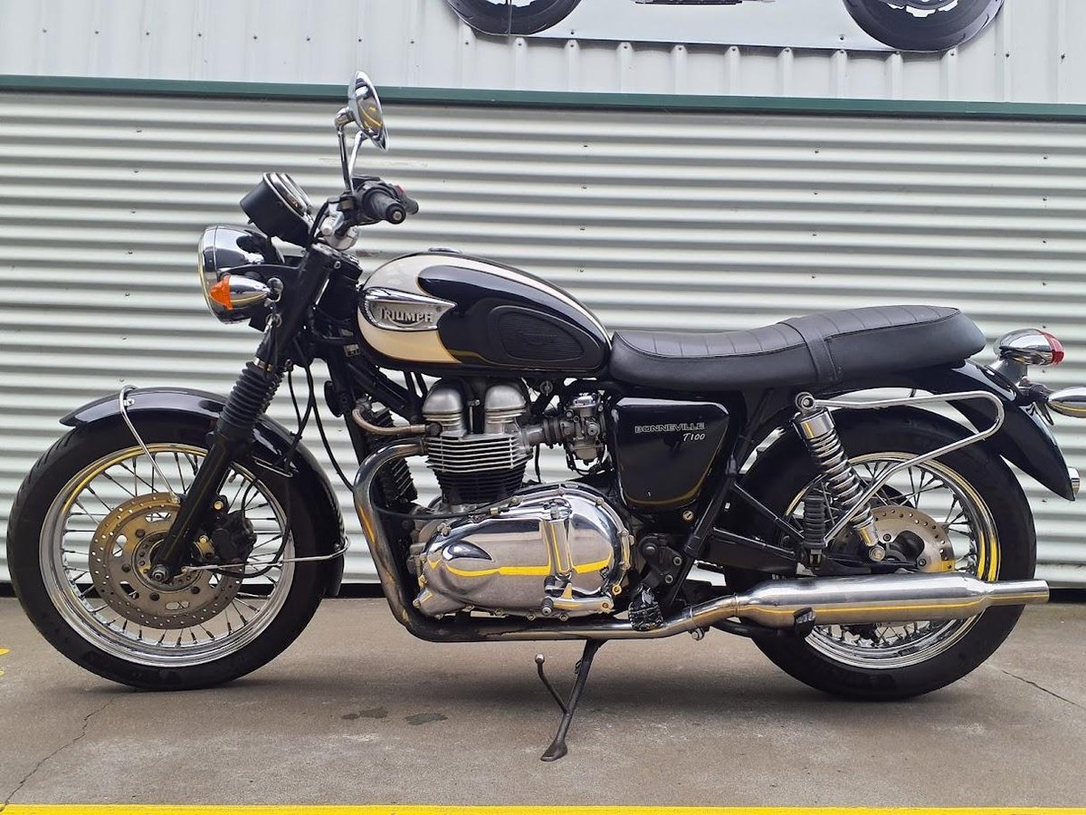 The 2004 Triumph Bonneville T100 is a modern classic motorcycle that pays homage to the iconic 1960s Bonneville. It features a 790cc air-cooled, parallel-twin engine delivering approximately 61 horsepower at 7,400 rpm and 60 Nm of torque at 3,500 rpm. The bike boasts a 5-speed gearbox, a dry weight of 205 kg, and a seat height of 775 mm. Its design includes spoked wheels, chrome accents, and a two-tone paint scheme, embodying retro aesthetics with contemporary performance.