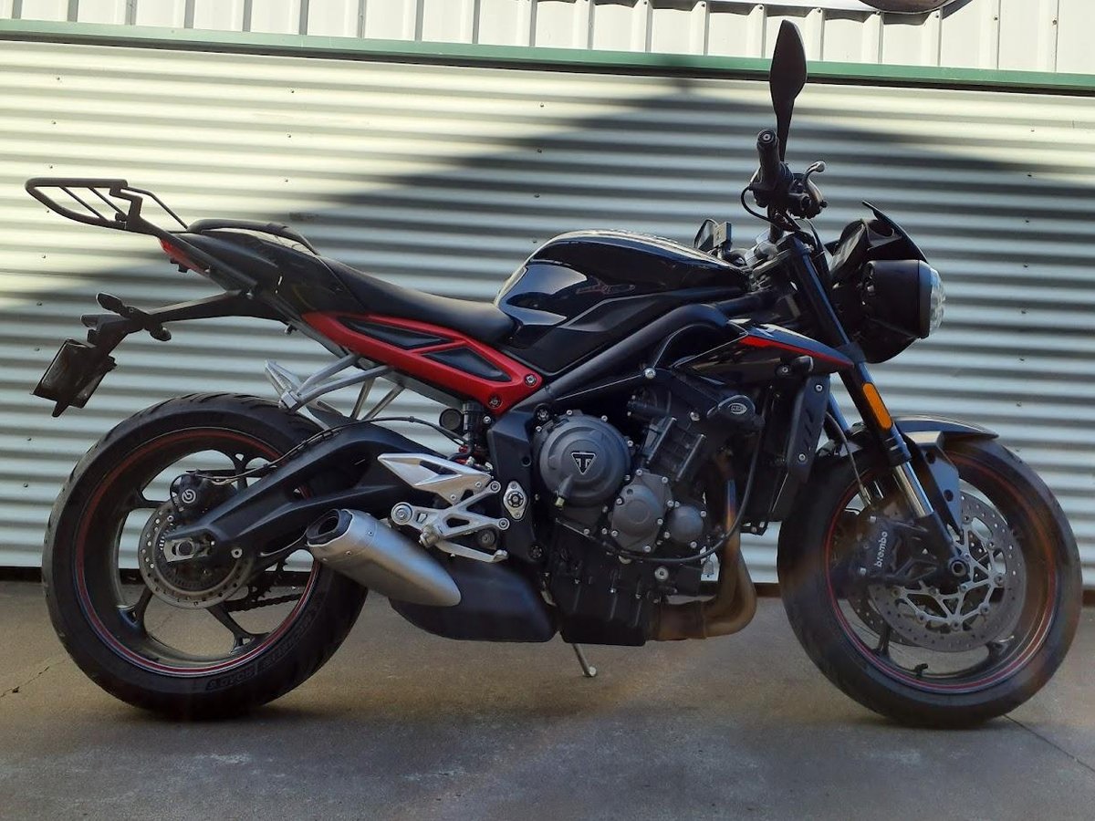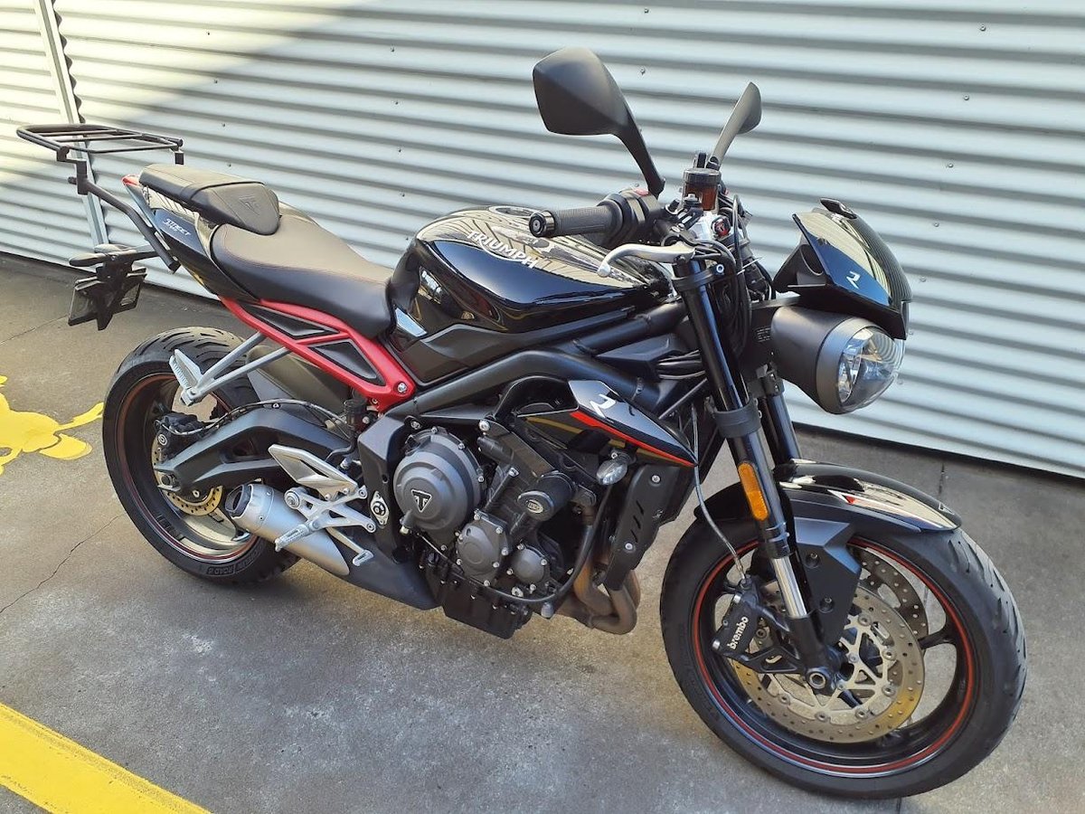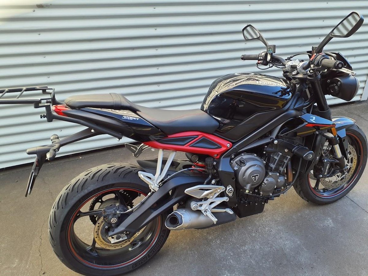 The 2019 Triumph Street Triple 765 R is a high-performance naked sportbike powered by a 765 cc liquid-cooled triple-cylinder engine that delivers lively power and strong mid-range torque, making it agile and thrilling on both street and canyon roads. It rides on a lightweight chassis with sporty ergonomics and responsive handling, and comes equipped with quality suspension and brakes that balance performance with everyday usability. This particular example also includes heated grips for enhanced comfort in cooler rides and a luggage rack to support touring or commuting gear.