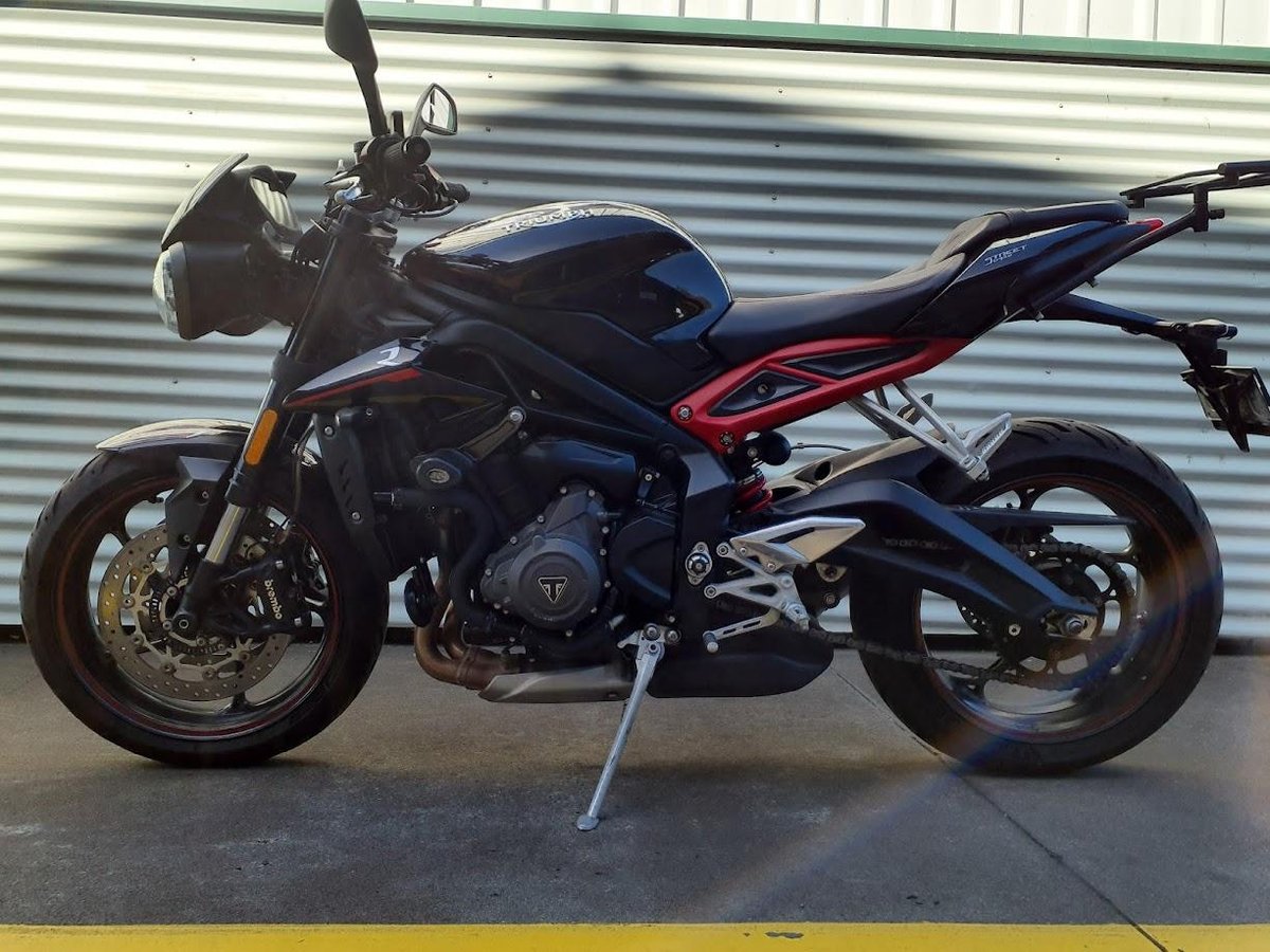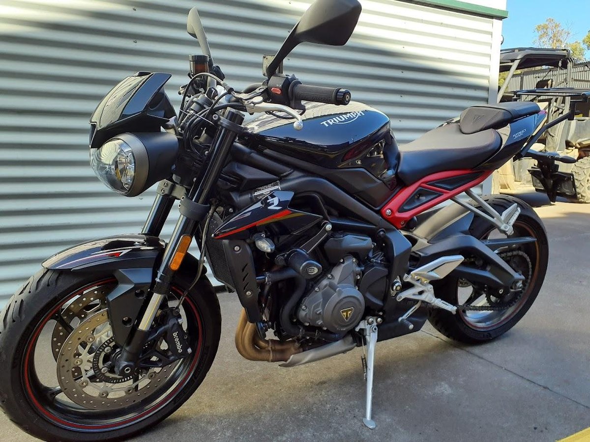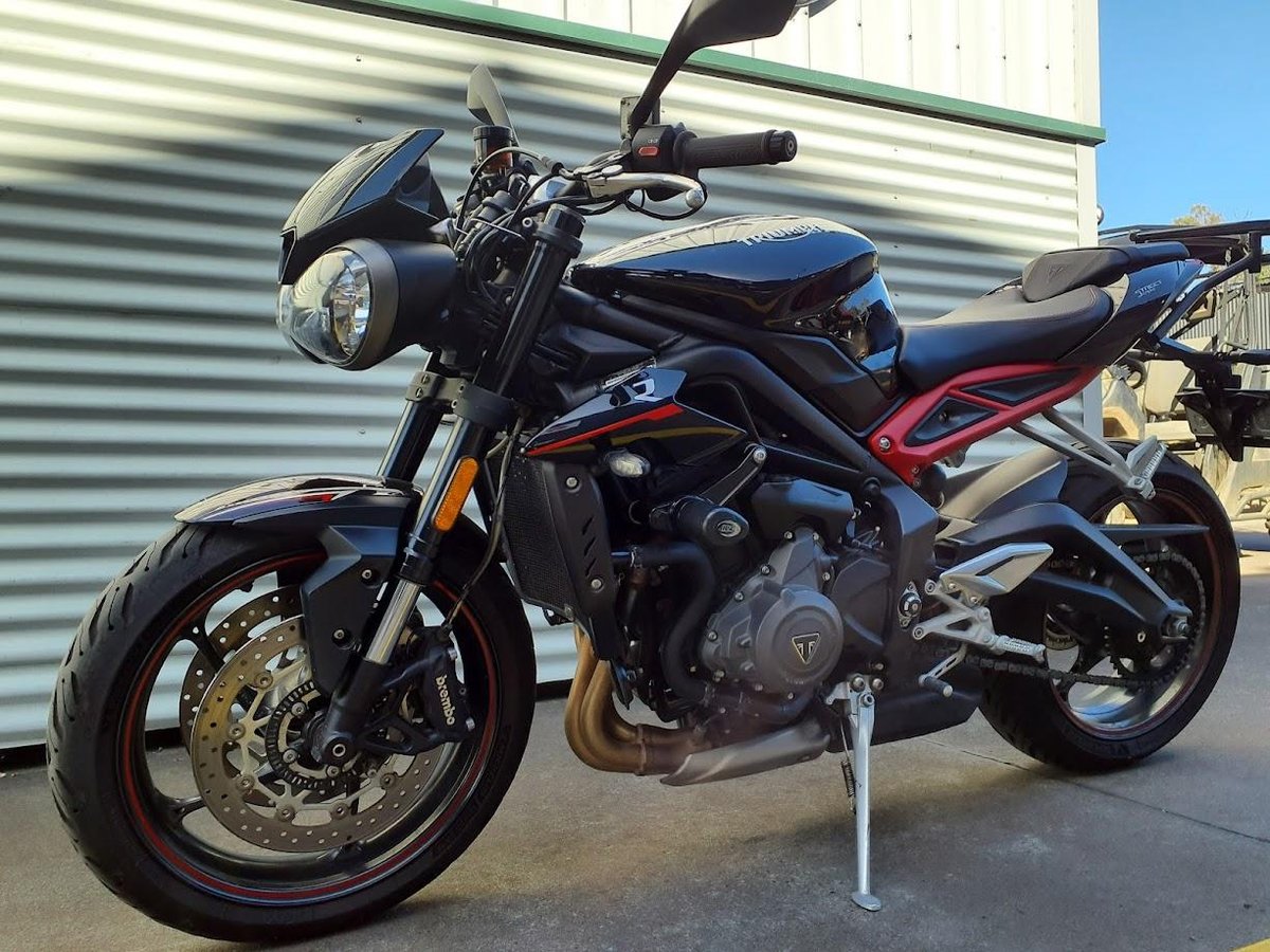 The 2019 Triumph Street Triple 765 R is a high-performance naked sportbike powered by a 765 cc liquid-cooled triple-cylinder engine that delivers lively power and strong mid-range torque, making it agile and thrilling on both street and canyon roads. It rides on a lightweight chassis with sporty ergonomics and responsive handling, and comes equipped with quality suspension and brakes that balance performance with everyday usability. This particular example also includes heated grips for enhanced comfort in cooler rides and a luggage rack to support touring or commuting gear.