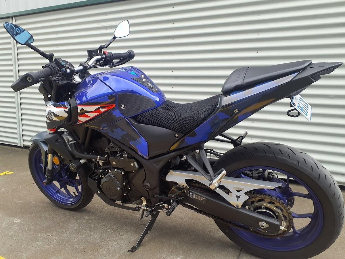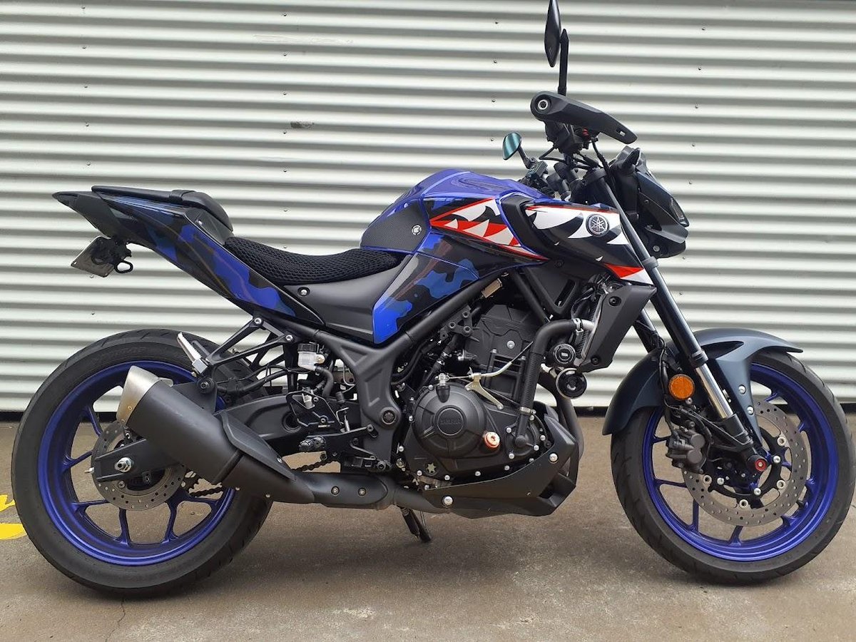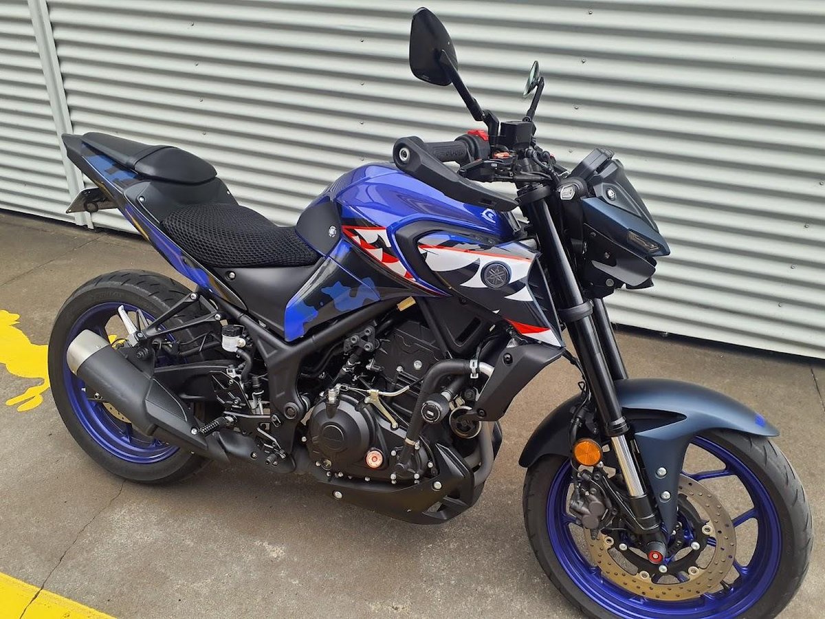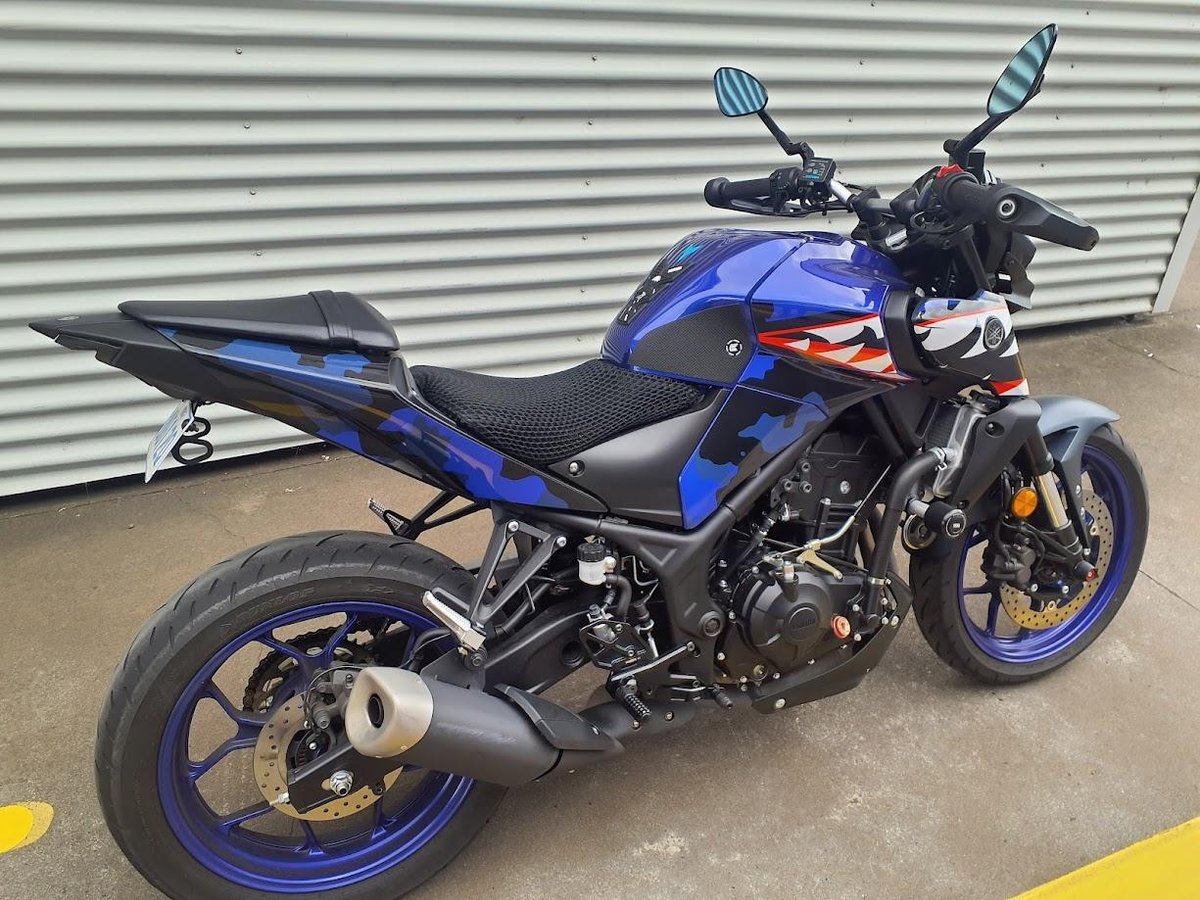 Learner Approved MotorCycle. The 2023 Yamaha MT-03LA is an agile naked sportbike powered by a 321 cc liquid-cooled parallel-twin engine that delivers smooth, responsive performance ideal for street riding and daily use. It features a lightweight chassis with sporty ergonomics, balanced suspension, and confident brakes for dynamic handling in urban and open-road settings. This specific bike is fitted with Bark Busters, a seat net, sump guard, sticker kit, tail tidy, and radiator guard, enhancing protection, utility, and custom looks without detracting from its playful performance nature.